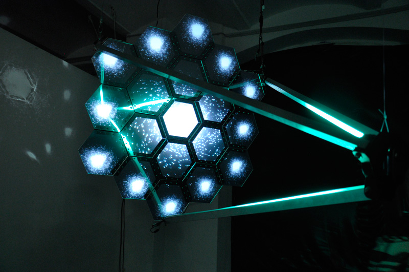 The piece interacts with its surroundings by surveying the space and capturing light with a sensor at the apex of its antenna-like structure. The light’s colour is then transmitted via LEDs to Tycho’s mirrored hexagonal surface, where it modulates in real-time a projection sequence inspired by images of cosmic nebulae and supernovae.